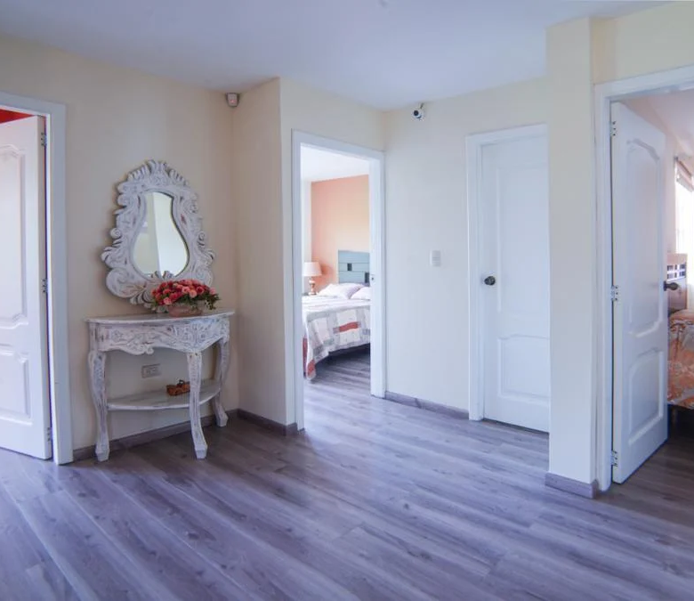 DETALLES DE ACABADOS Pisos de porcelanato y piso flotante. Paredes pintadas y empastadas, extractor de olores, cocina y horno.