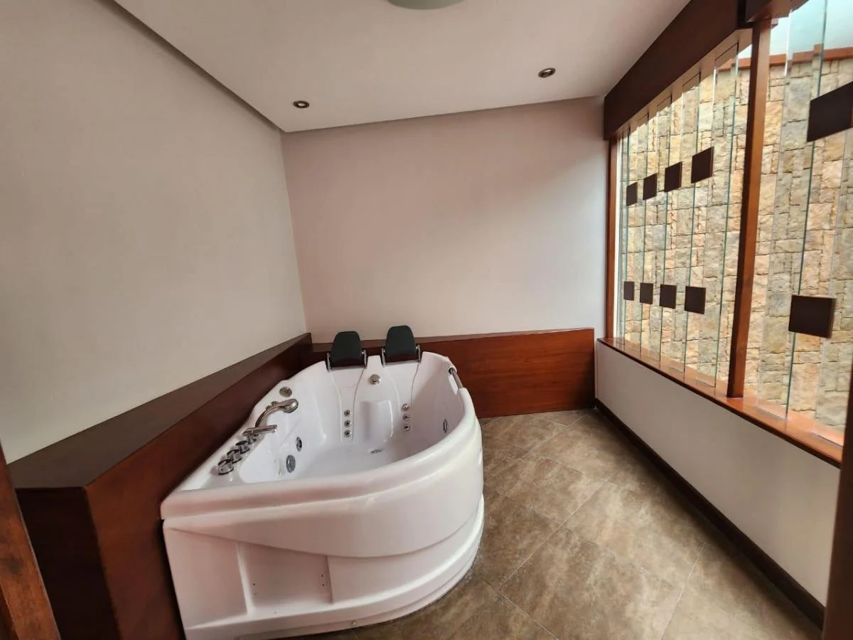 Una área con un jacuzzi,