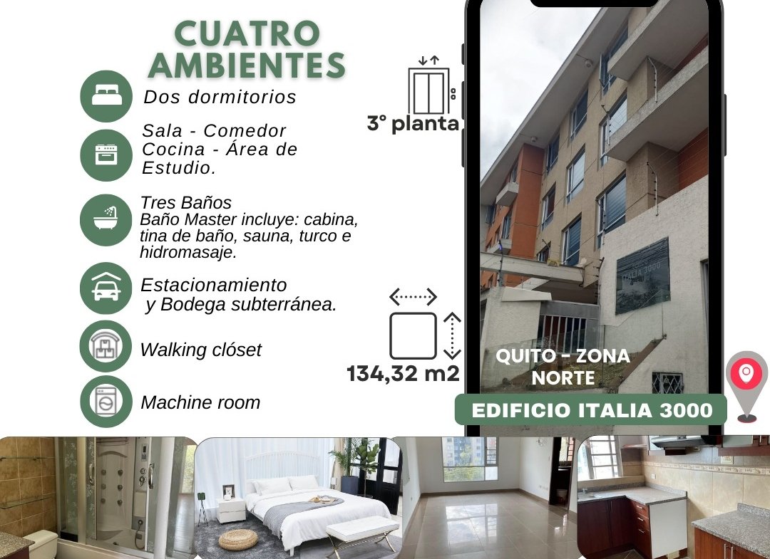 Se vende departamento ubicado en sector de alta plusvalía, Parque Italia, cerca del la Universidad Central. Cuenta con servicios de gas centralizado, agua caliente, ascensor, bodega propia y un parqueadero.