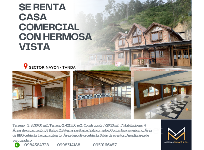 Terreno 1: 8.530,00 m2; Terreno 2: 4.215,00 m2; Construcción 929,13m2; 7 Habitaciones; 4 Áreas de capacitación; 8 Baños; 2 Baterías sanitarias; Sala comedor; Cocina Tipo americano Área de BBQ cubierta; Jacuzzi cubierto; Área deportiva cubierta; Salón de eventos; Amplia área de parqueadero, también cuenta con una hermosa vista de Nayon