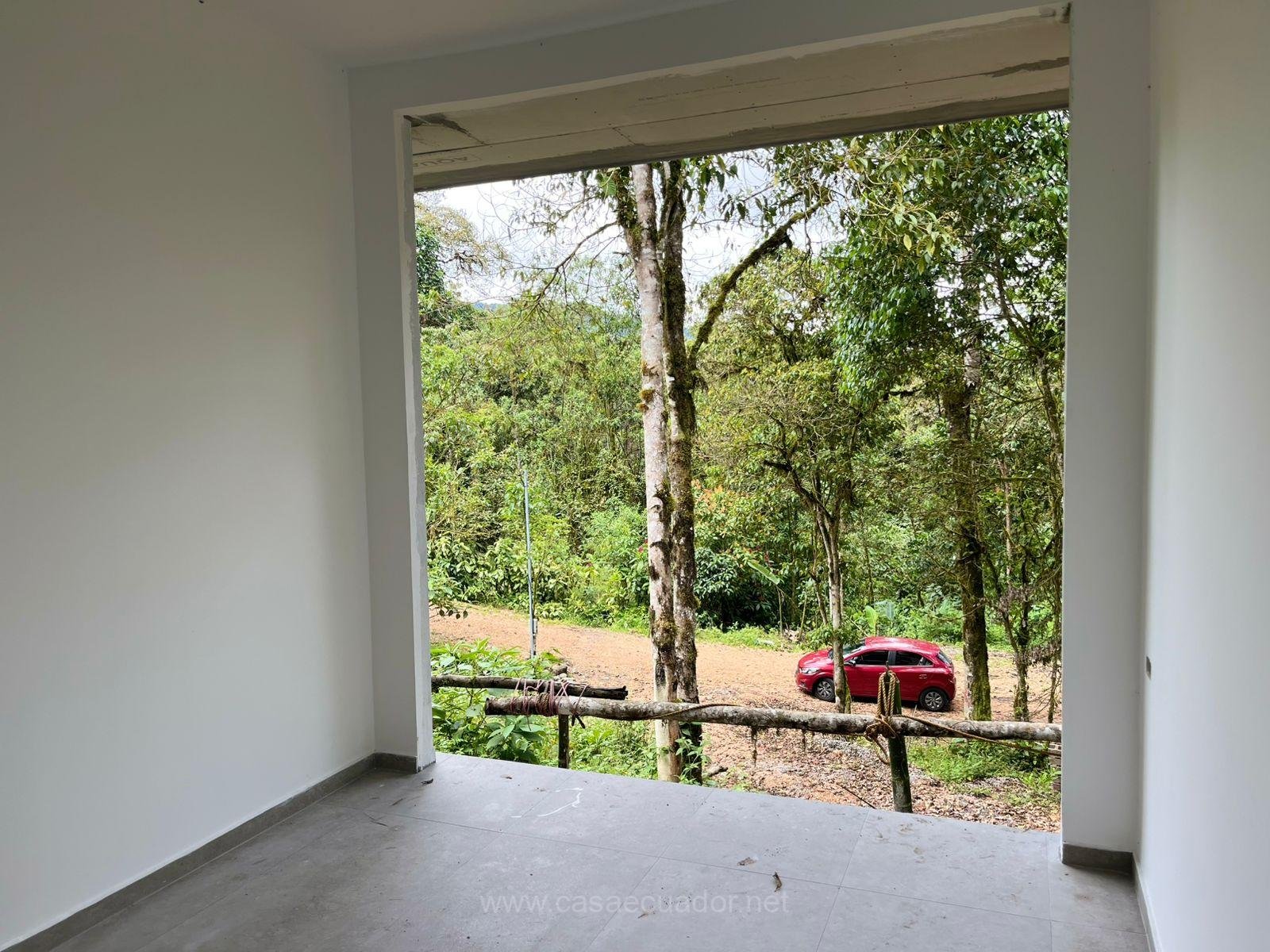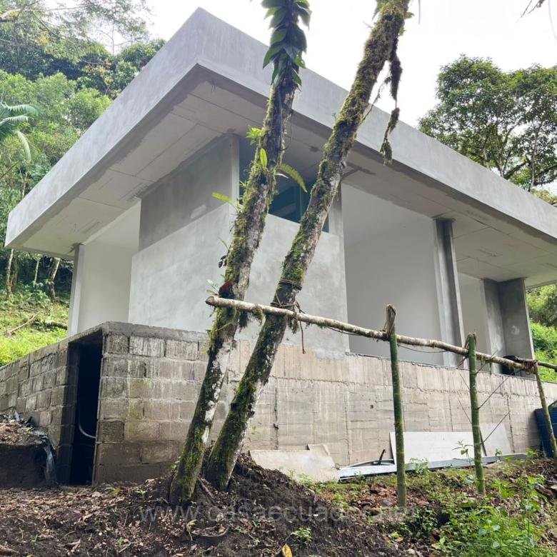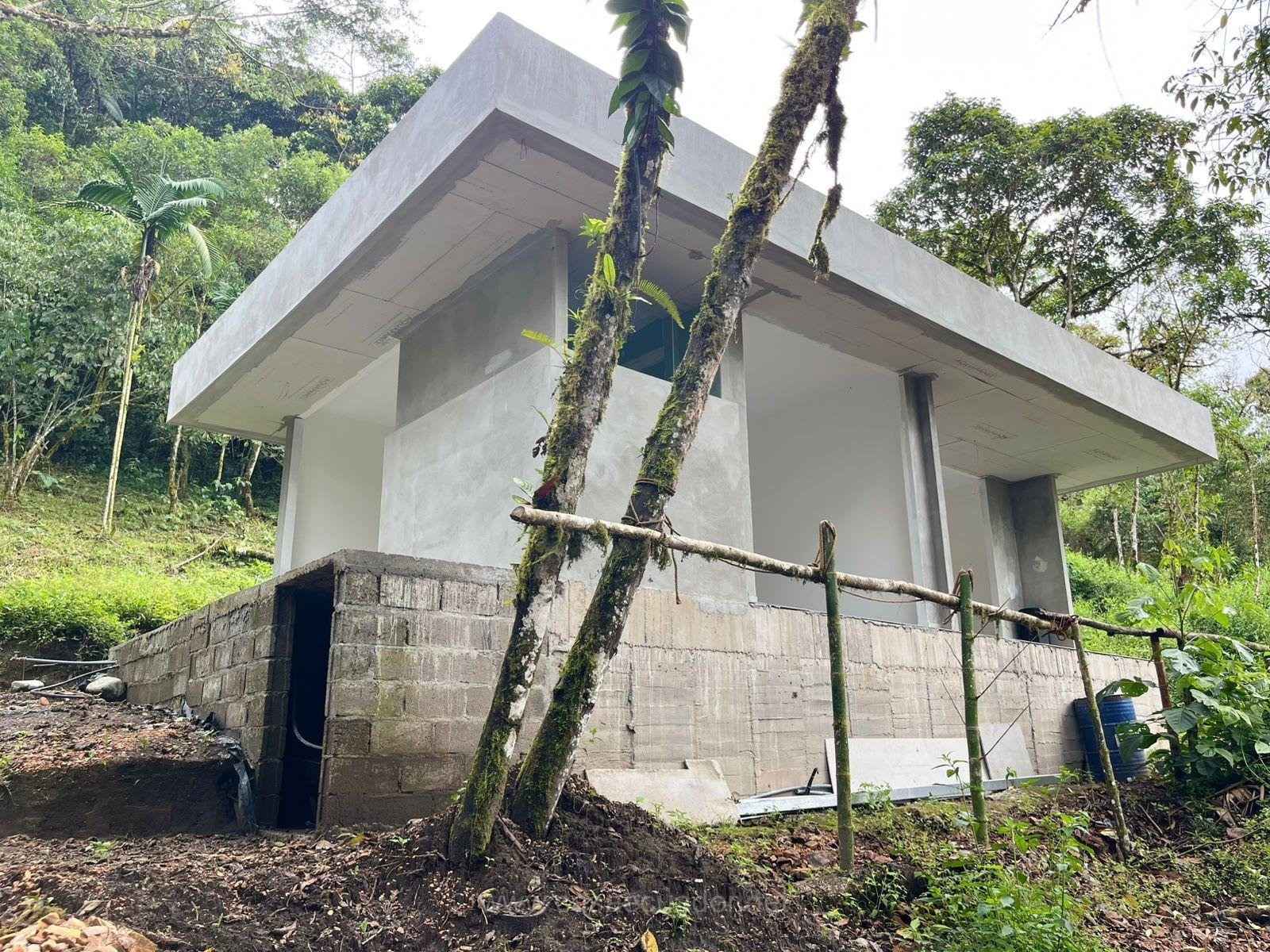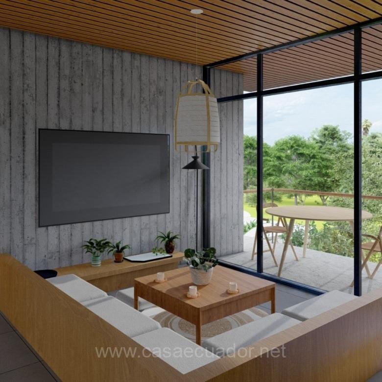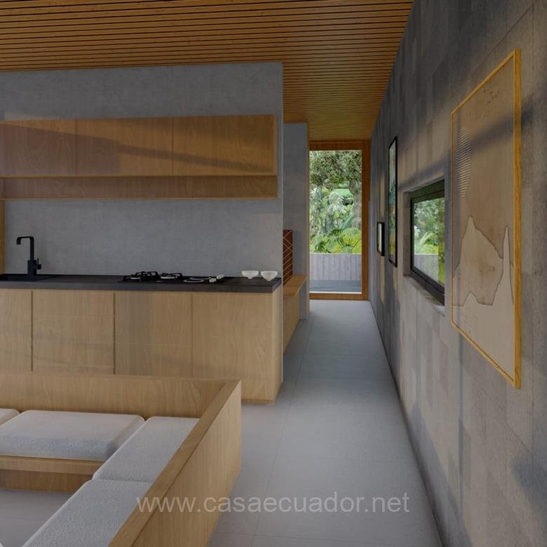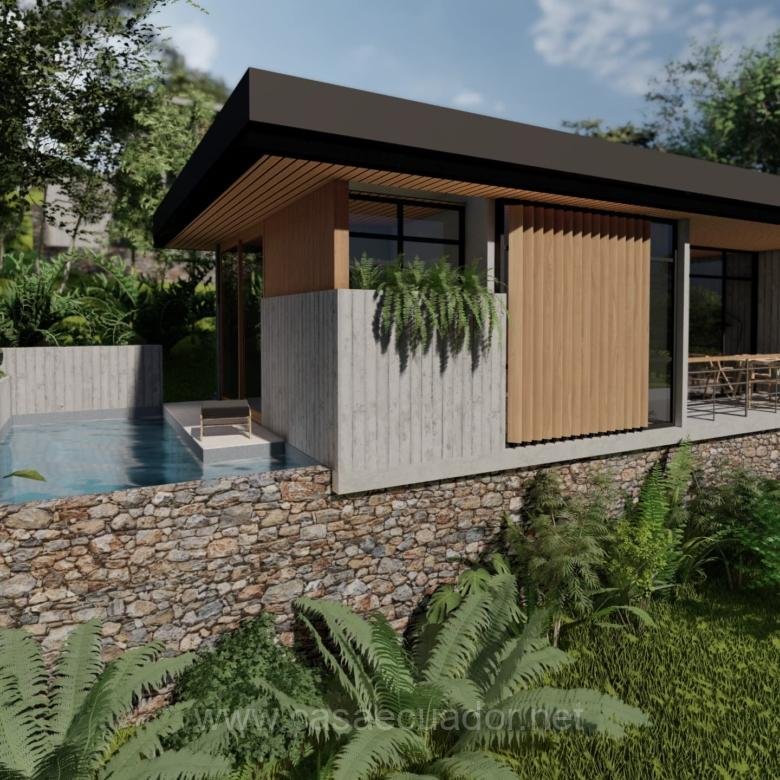 🏠 Acabados de alta gama: cielos rasos en PVC maderado, fachada en hormigón visto y detalles en piedra, que reflejan el entorno tropical de Mindo.