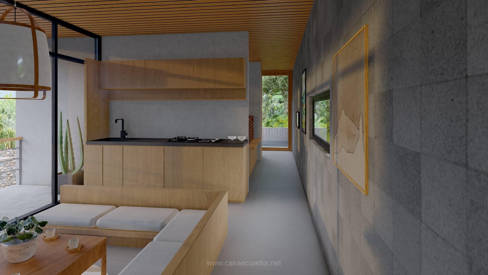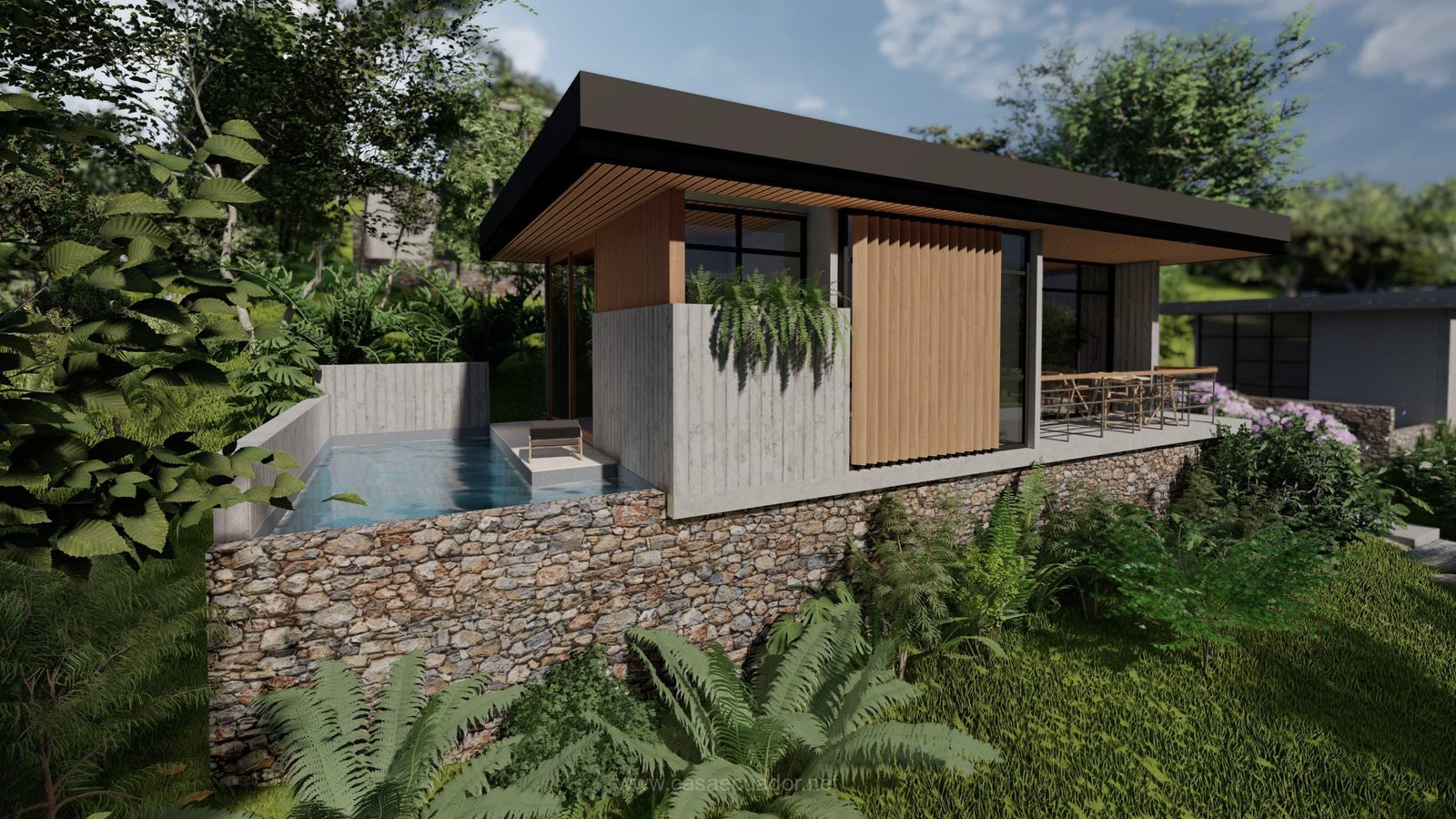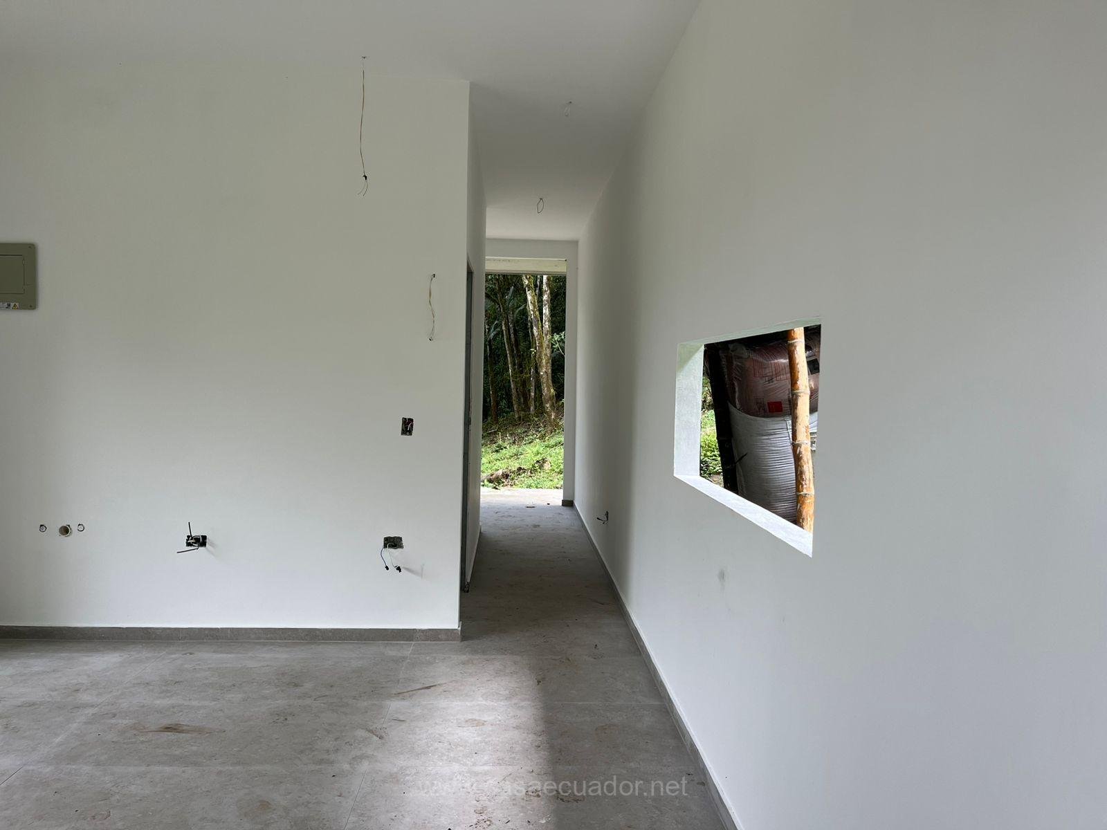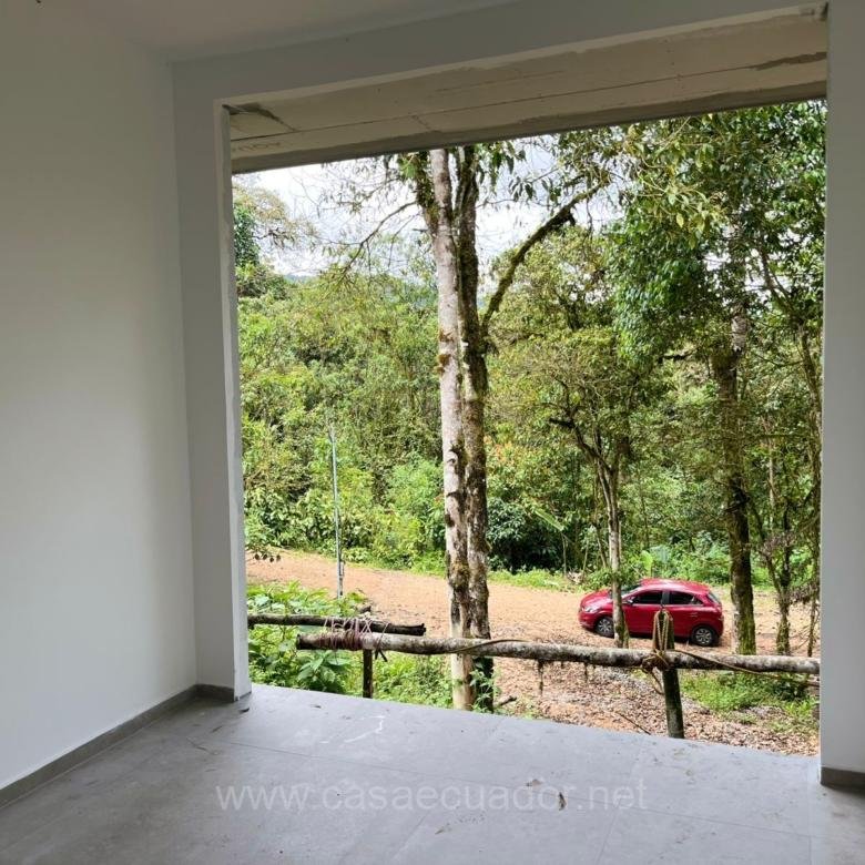 🏠 Acabados de alta gama: cielos rasos en PVC maderado, fachada en hormigón visto y detalles en piedra, que reflejan el entorno tropical de Mindo.