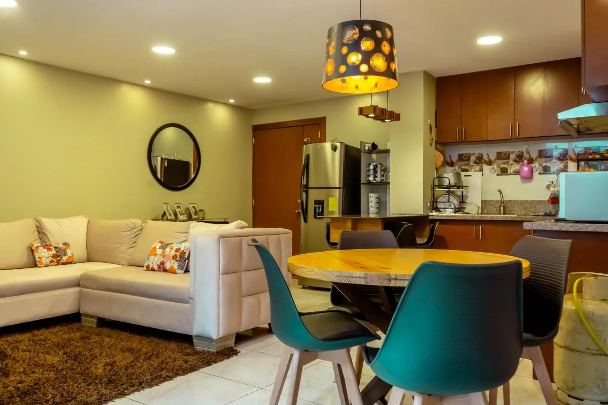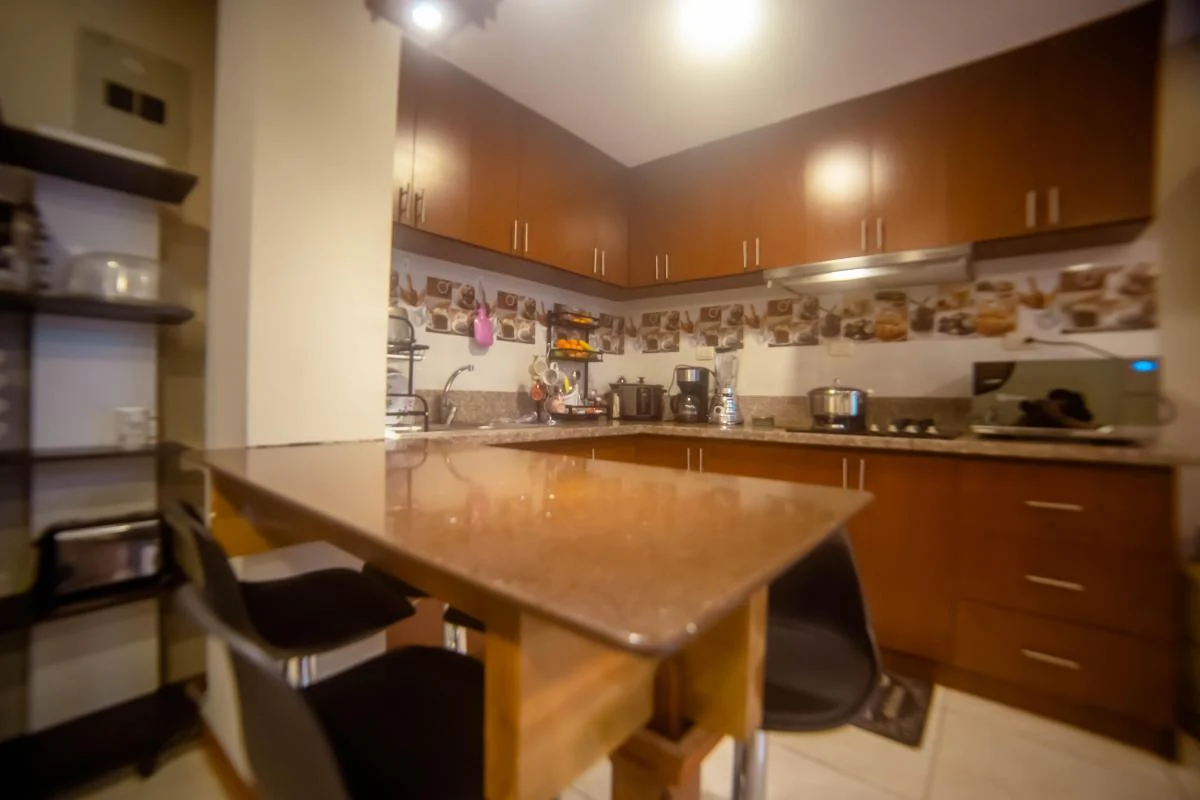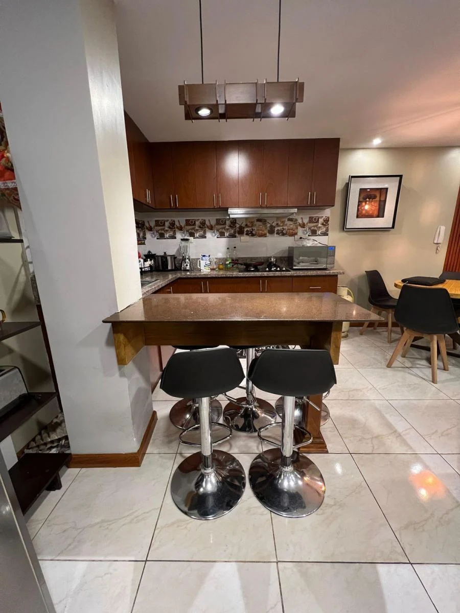 Comedor, cocina (cuenta con lámparas decorativas y desayunador) con instalación de cocina de inducción y cocina a gas.